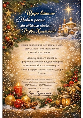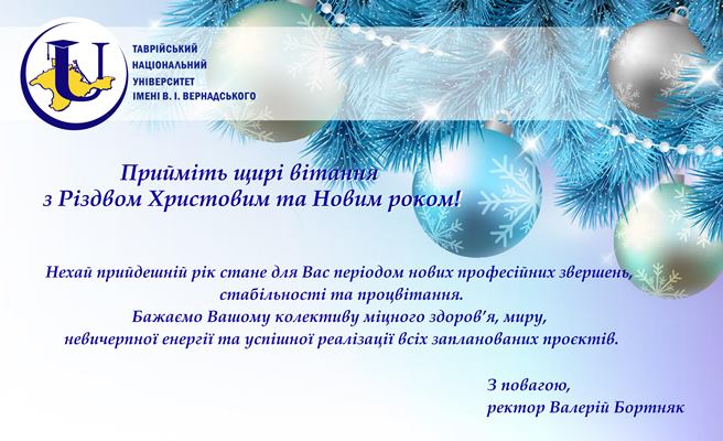 Прийміть найщиріші вітання з чудовими святами – Новим роком та Різдвом Христовим. Нехай ці свята – вісники майбутніх звершень, здійснення мрій і сподівань – принесуть Вам і Вашим родинам щастя, добро, любов, мир і достаток. Бажаю віри у власні сили, щоб у новому році Ви зробили все те, про що давно мріяли. Хочу, щоб у новому році Ви ще більше відчували турботу з боку колег, тепло друзів та близьких. Щастя Вам, міцного здоров’я, світлого майбутнього!
